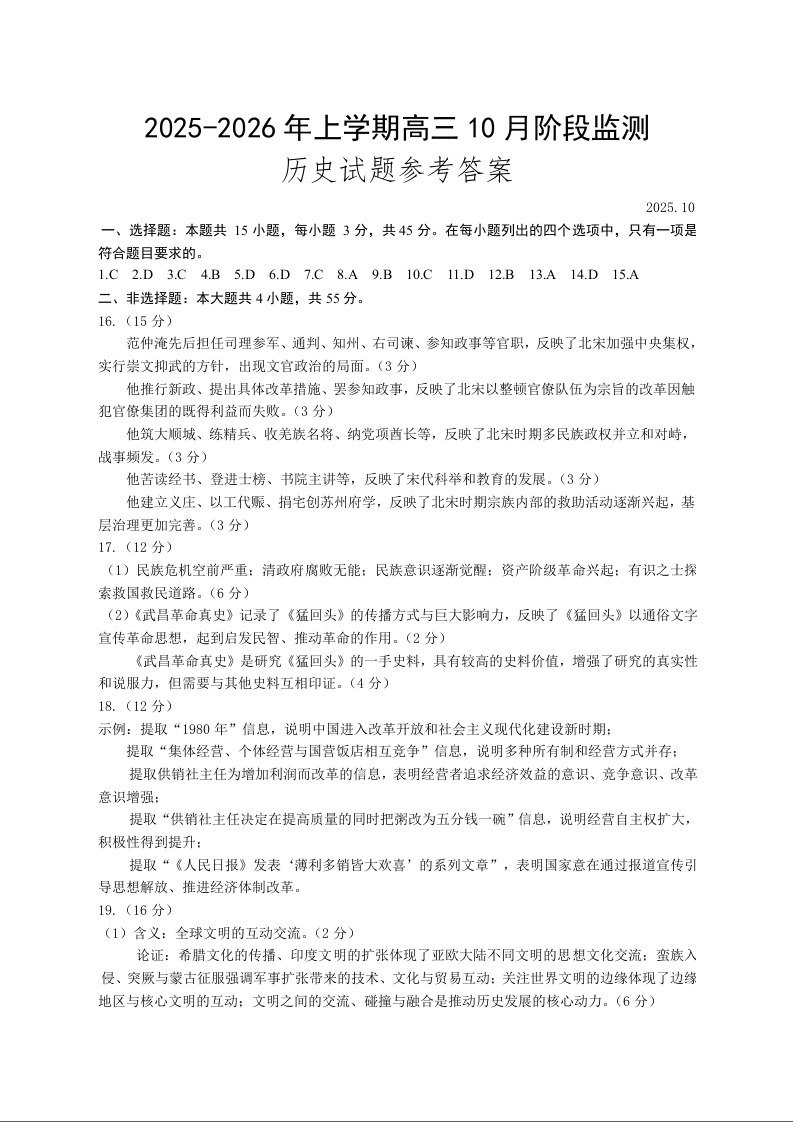 高三历史答案--潍坊部分区域2025.10高三阶段性统考