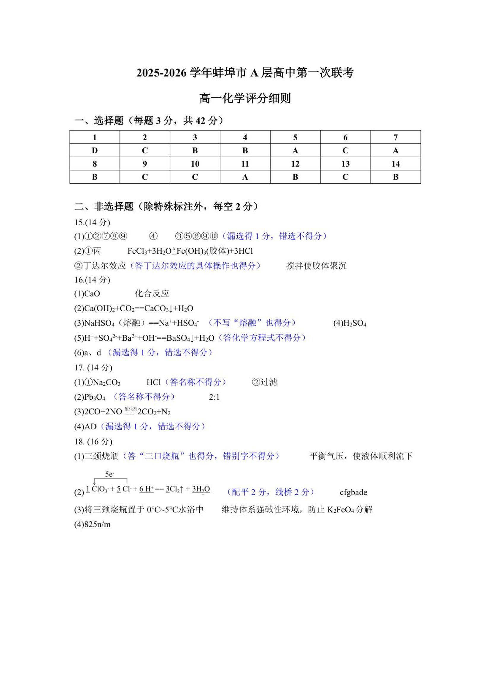高一化学答案--安徽省蚌埠市A层高中2025-2026学年高一上学期10月月考