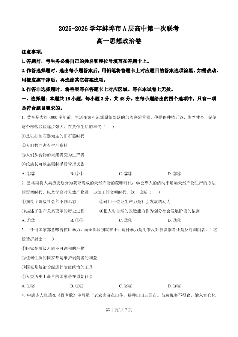 高三政治(原卷版)--安徽省蚌埠市A层高中2025-2026学年高一上学期10月月考