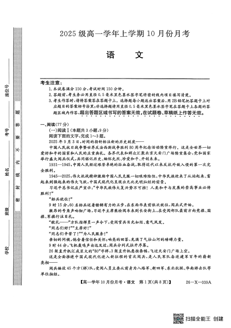 高一语文--黑龙江省龙东联盟2025-2026学年高一上学期10月月考