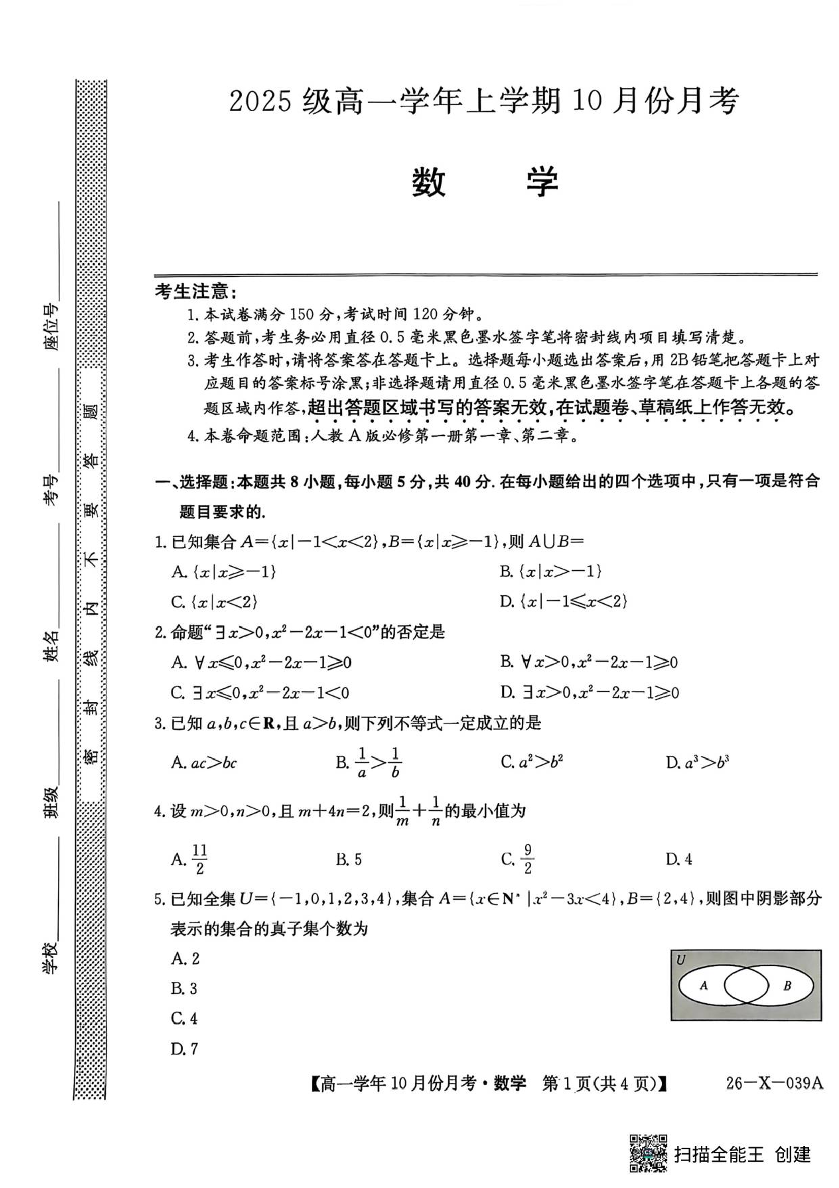 高一数学--黑龙江省龙东联盟2025-2026学年高一上学期10月月考