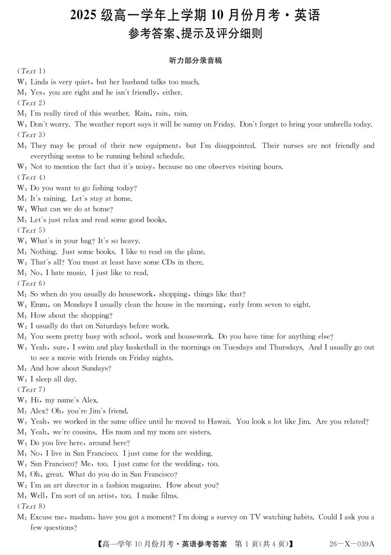 高一英语答案--黑龙江省龙东联盟2025-2026学年高一上学期10月月考