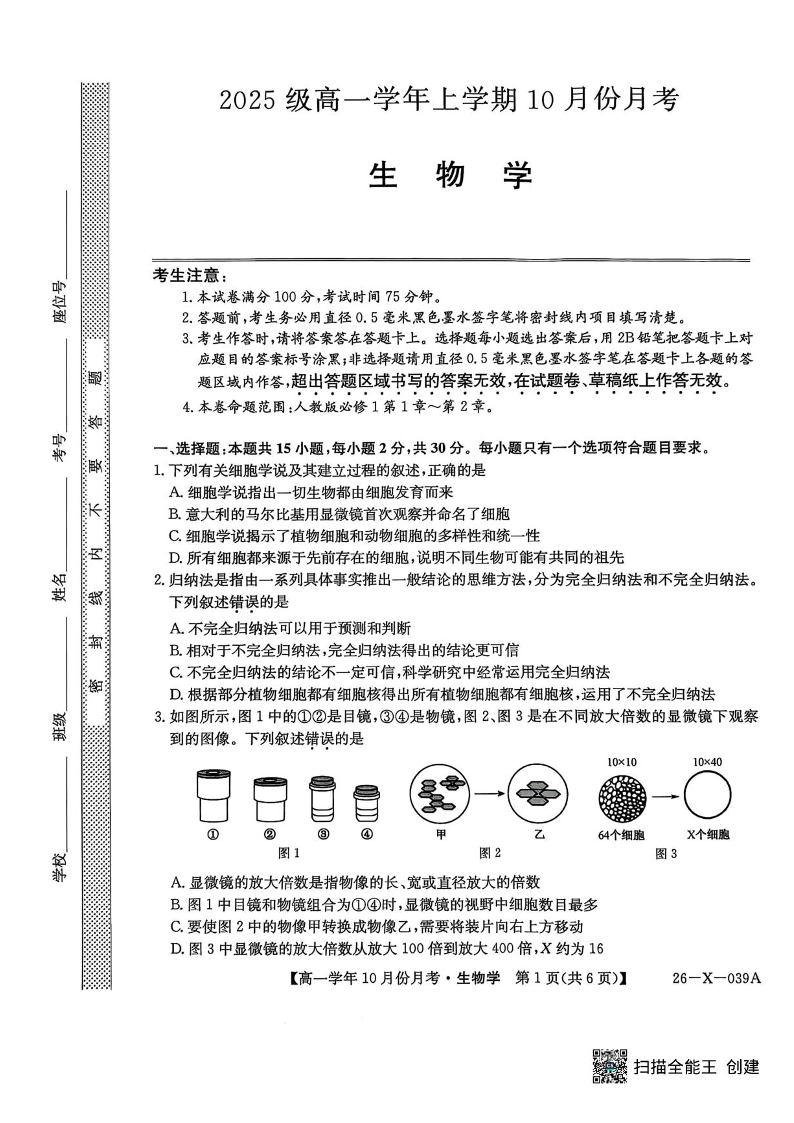高一生物+答案--黑龙江省龙东联盟2025-2026学年高一上学期10月月考