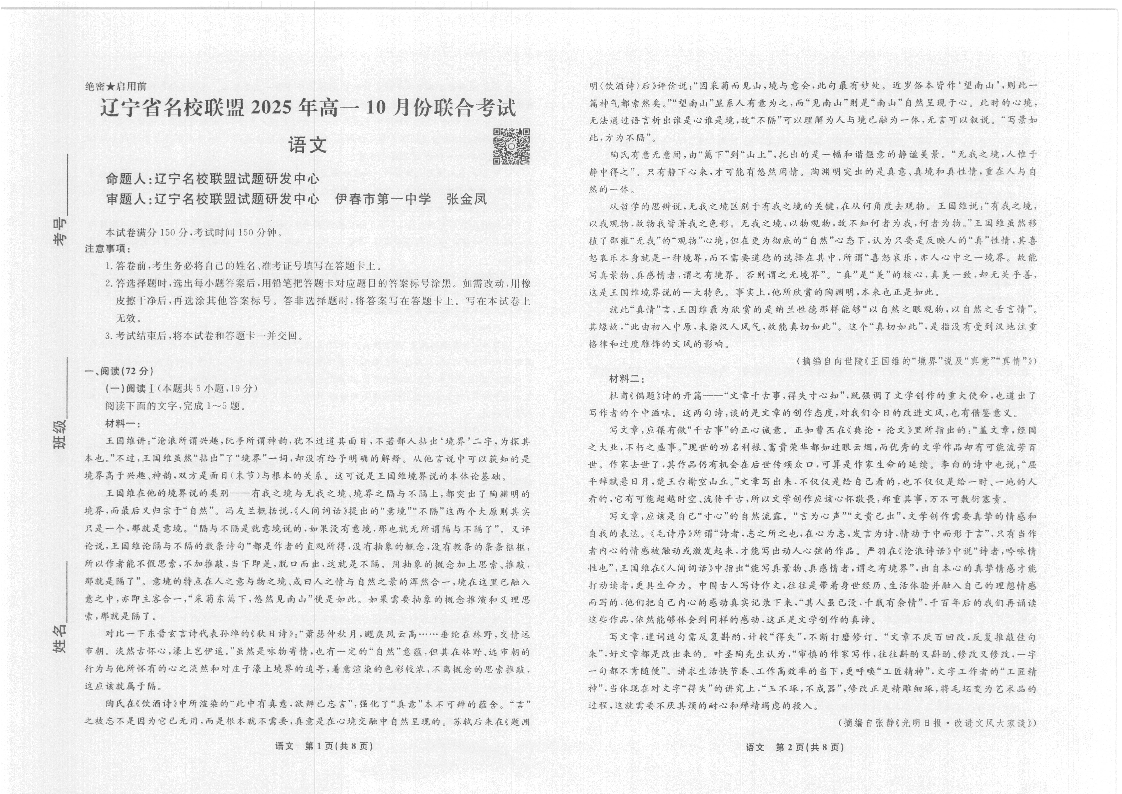 高一语文--辽宁省名校联盟2025年高一10月份联合考试