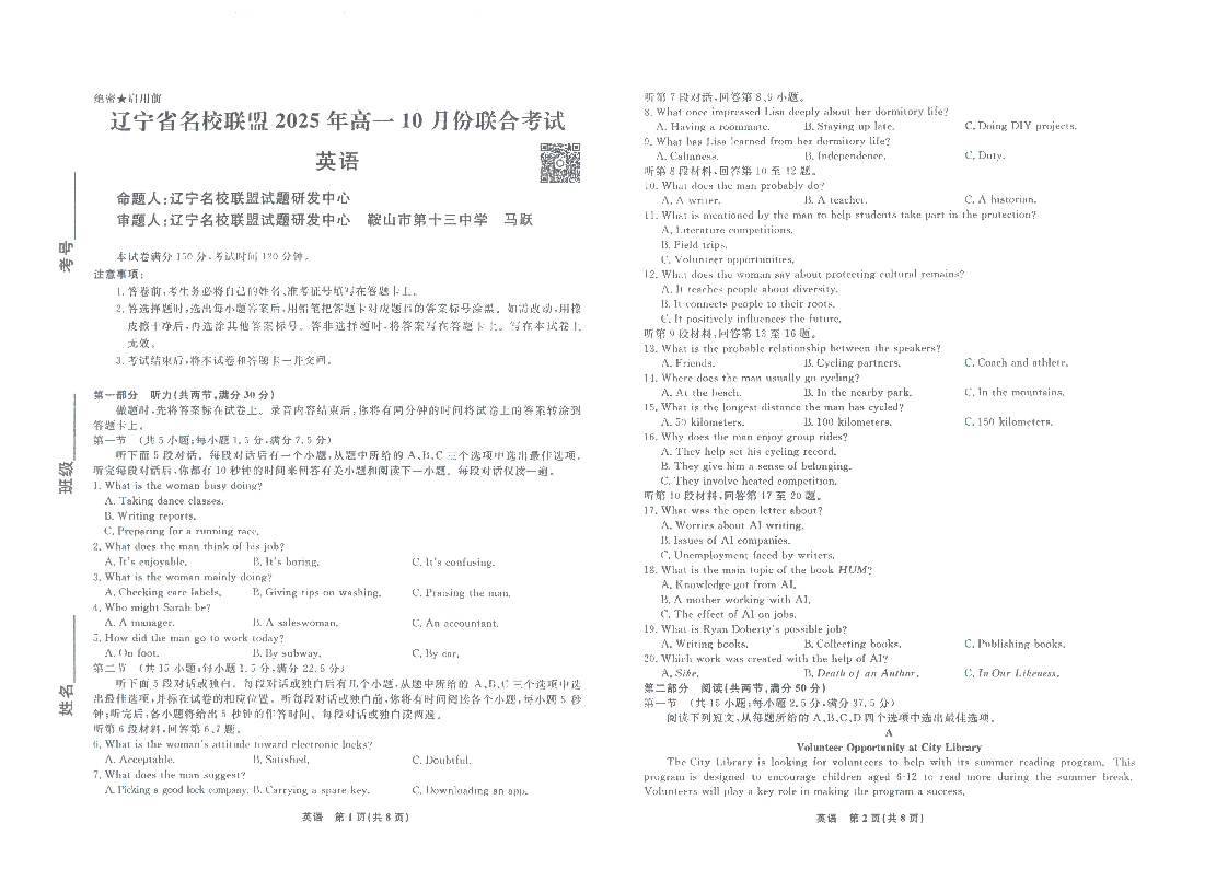 高一英语--辽宁省名校联盟2025年高一10月份联合考试