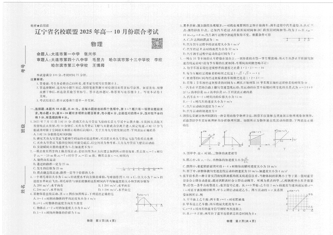 高一物理--辽宁省名校联盟2025年高一10月份联合考试