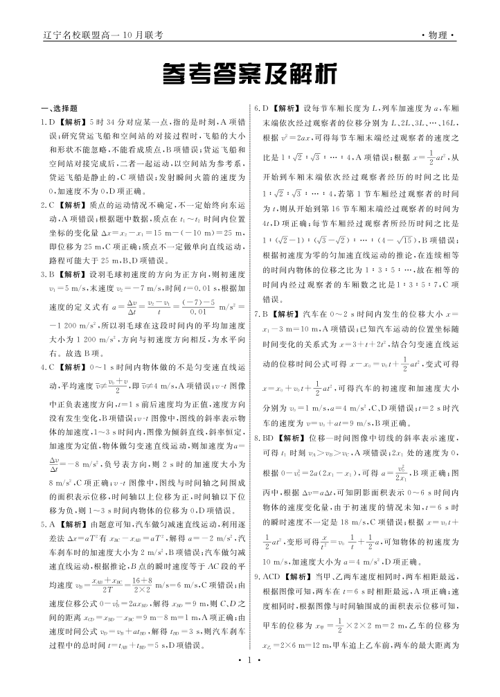 高一物理答案--辽宁省名校联盟2025年高一10月份联合考试