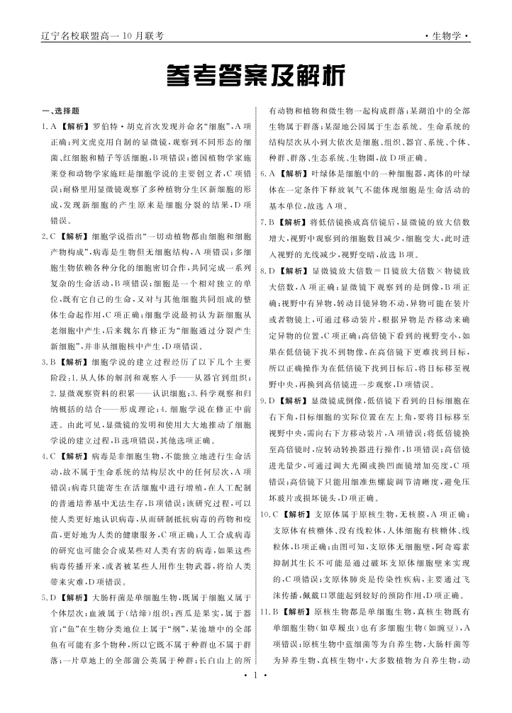 高一生物答案--辽宁省名校联盟2025年高一10月份联合考试