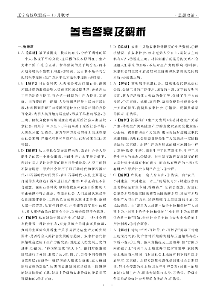 高一政治答案--辽宁省名校联盟2025年高一10月份联合考试