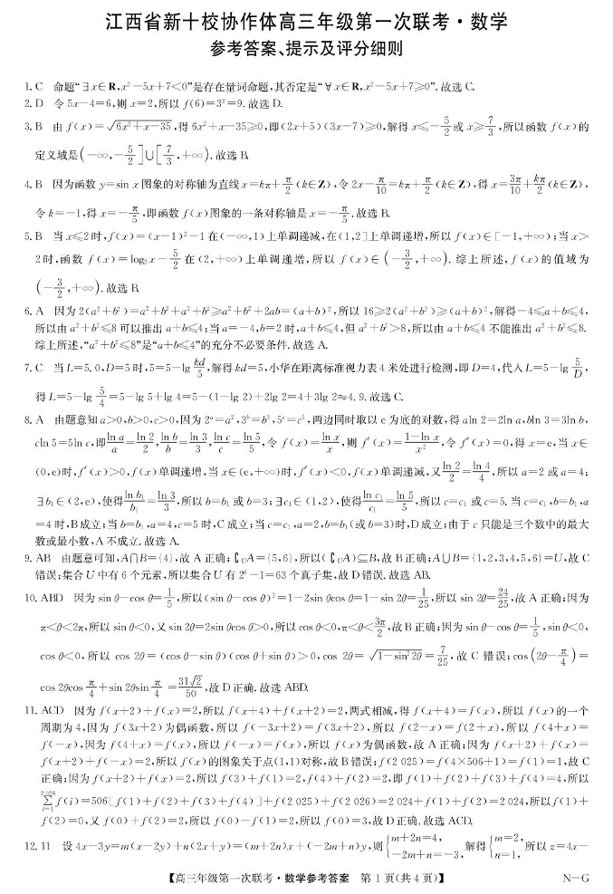 高三数学答案--江西省九师联盟新十校协作体2026届高三上学期第一次联考