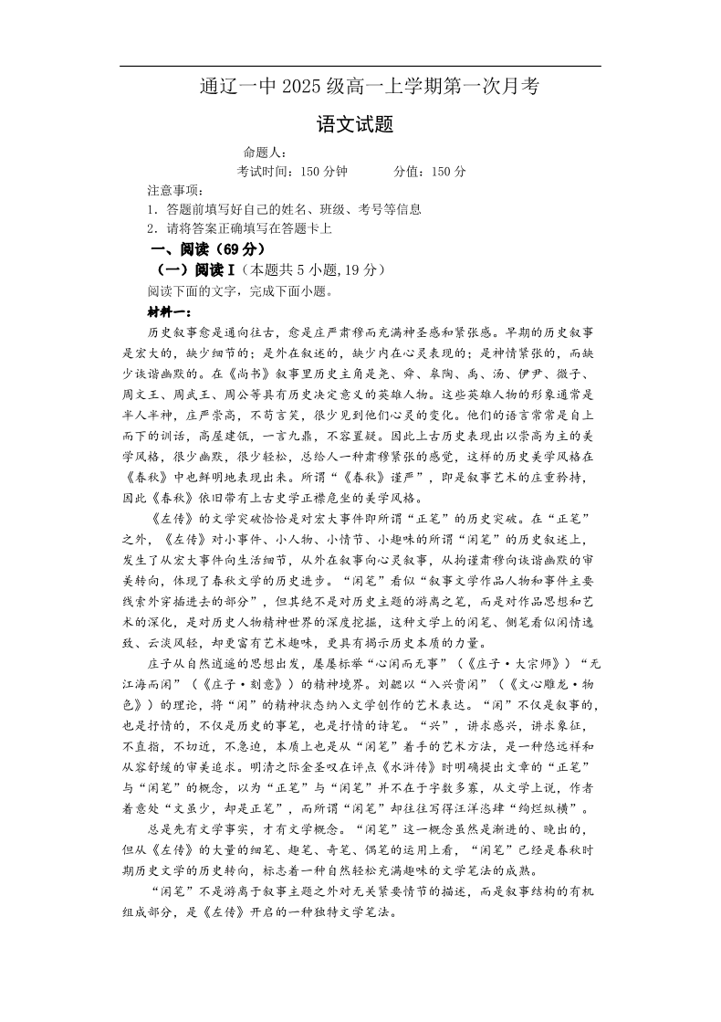 高一语文--内蒙古通辽市第一中学2025-2026学年高一上学期第一次月考
