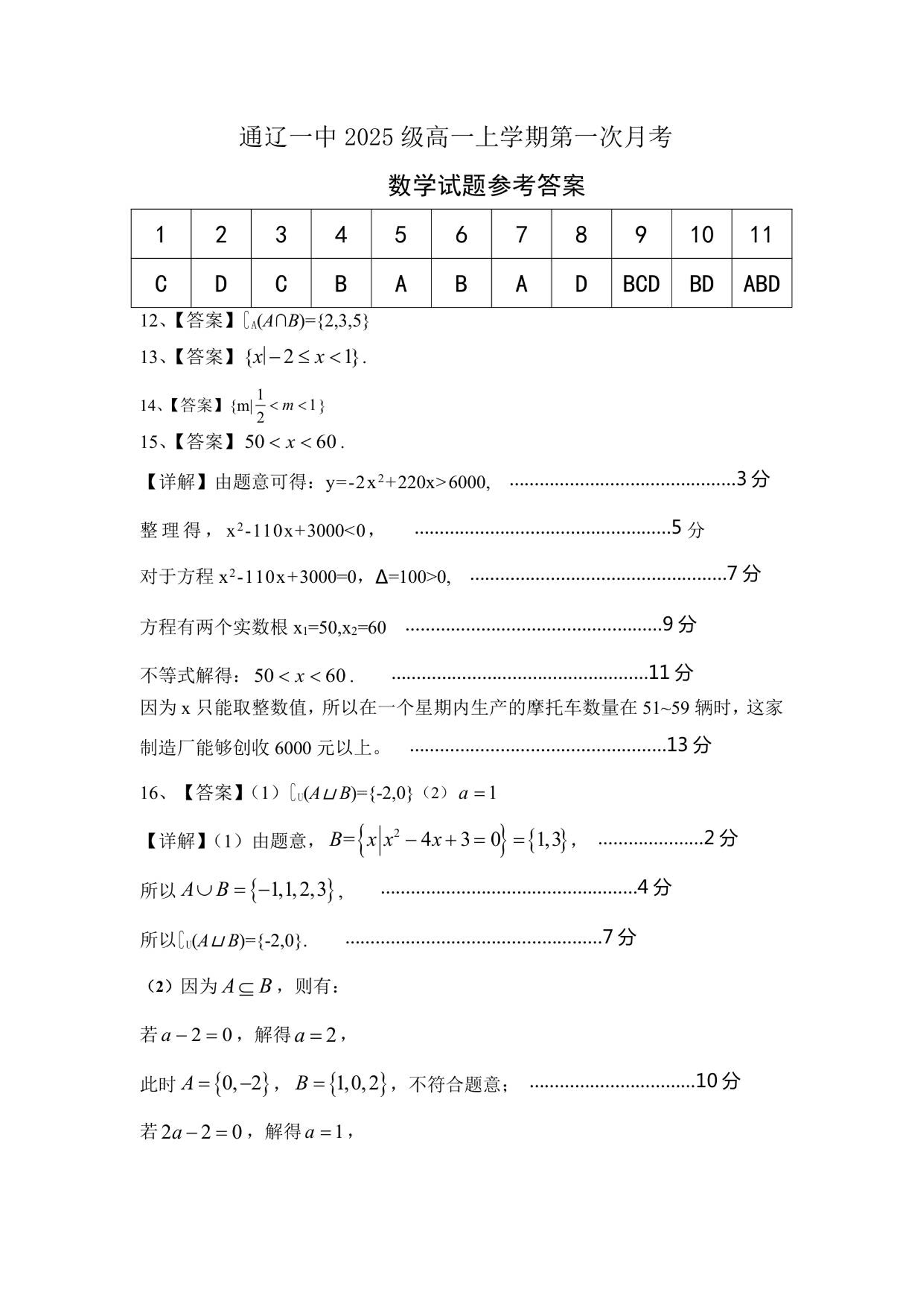 高一数学答案--内蒙古通辽市第一中学2025-2026学年高一上学期第一次月考