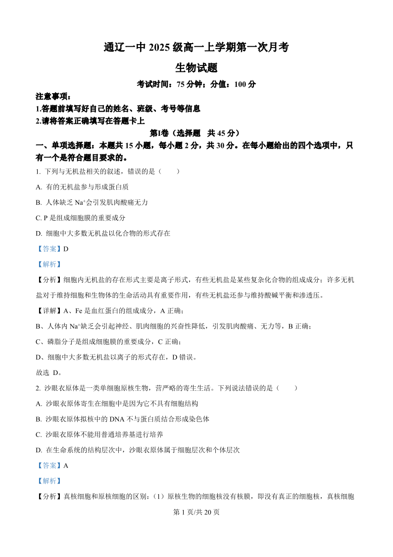 高一生物(精品解析版)--内蒙古通辽市第一中学2025-2026学年高一上学期第一次月考