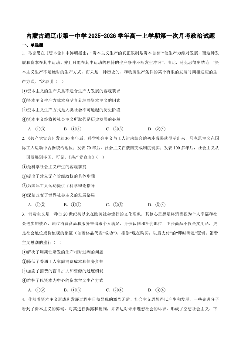 高一政治+答案--内蒙古通辽市第一中学2025-2026学年高一上学期第一次月考