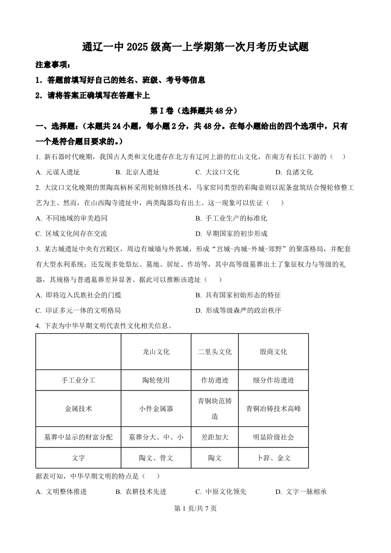 高一历史(原卷版)--内蒙古通辽市第一中学2025-2026学年高一上学期第一次月考