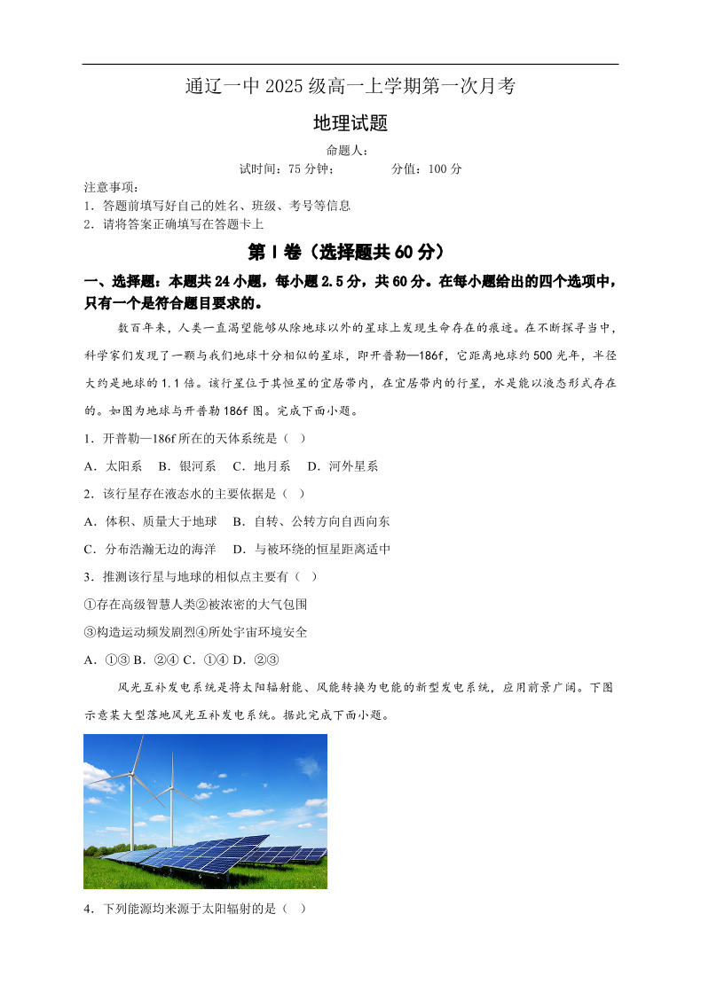 高一地理--内蒙古通辽市第一中学2025-2026学年高一上学期第一次月考