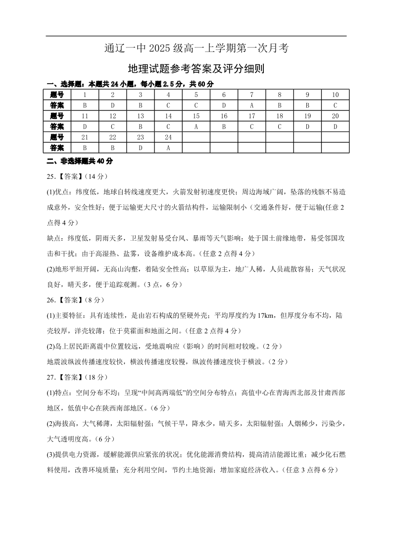 高一地理答案--内蒙古通辽市第一中学2025-2026学年高一上学期第一次月考