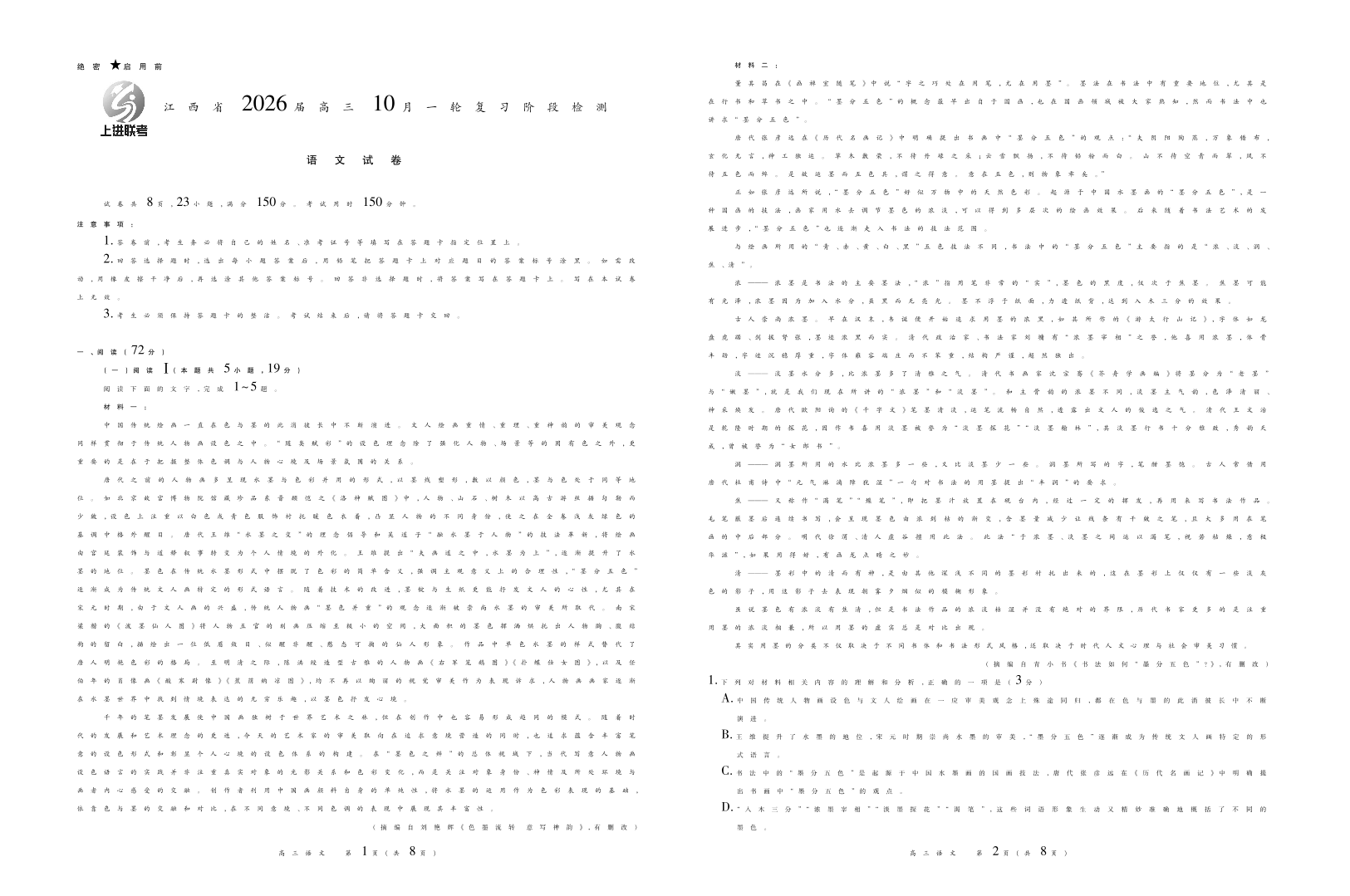 高三语文--江西省上进联考2026届高三10月一轮复习阶段检测