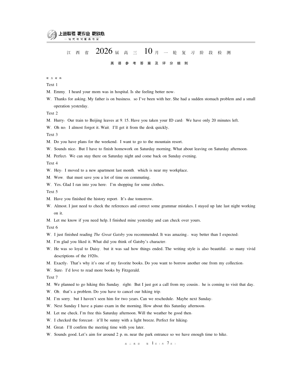 高三英语答案--江西省上进联考2026届高三10月一轮复习阶段检测