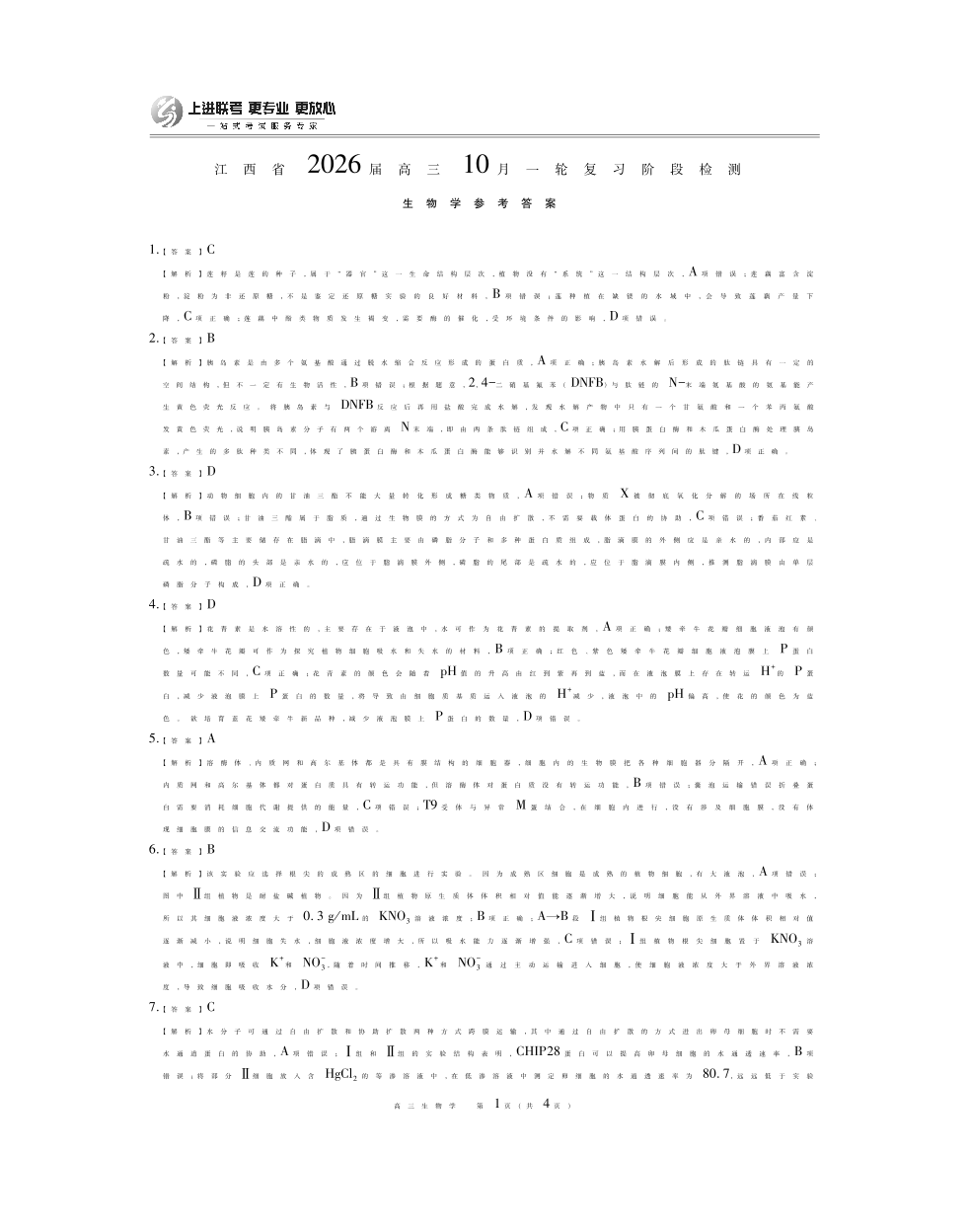 高三生物答案--江西省上进联考2026届高三10月一轮复习阶段检测