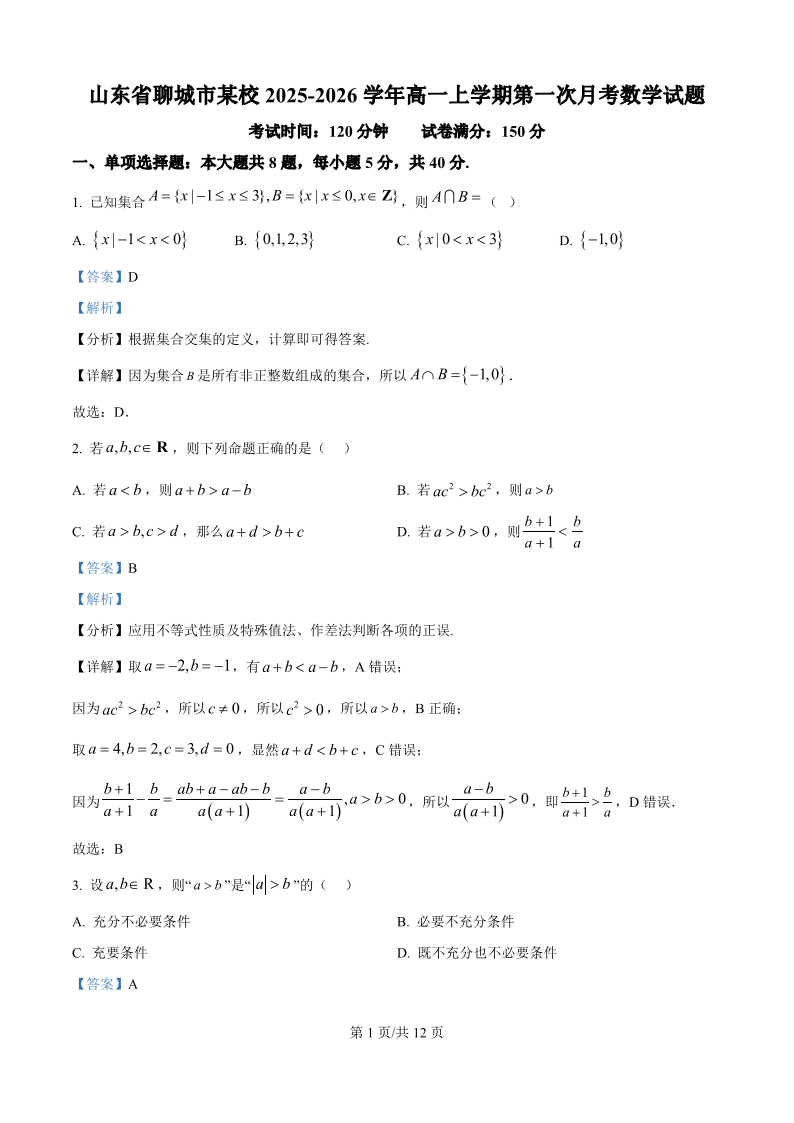 高一数学(精品解析版)--山东省聊城市某校2025-2026学年高一上学期第一次月考
