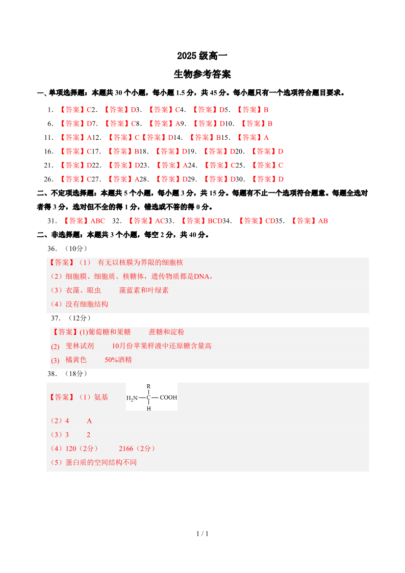 高一生物答案--山东省聊城市某校2025-2026学年高一上学期第一次月考