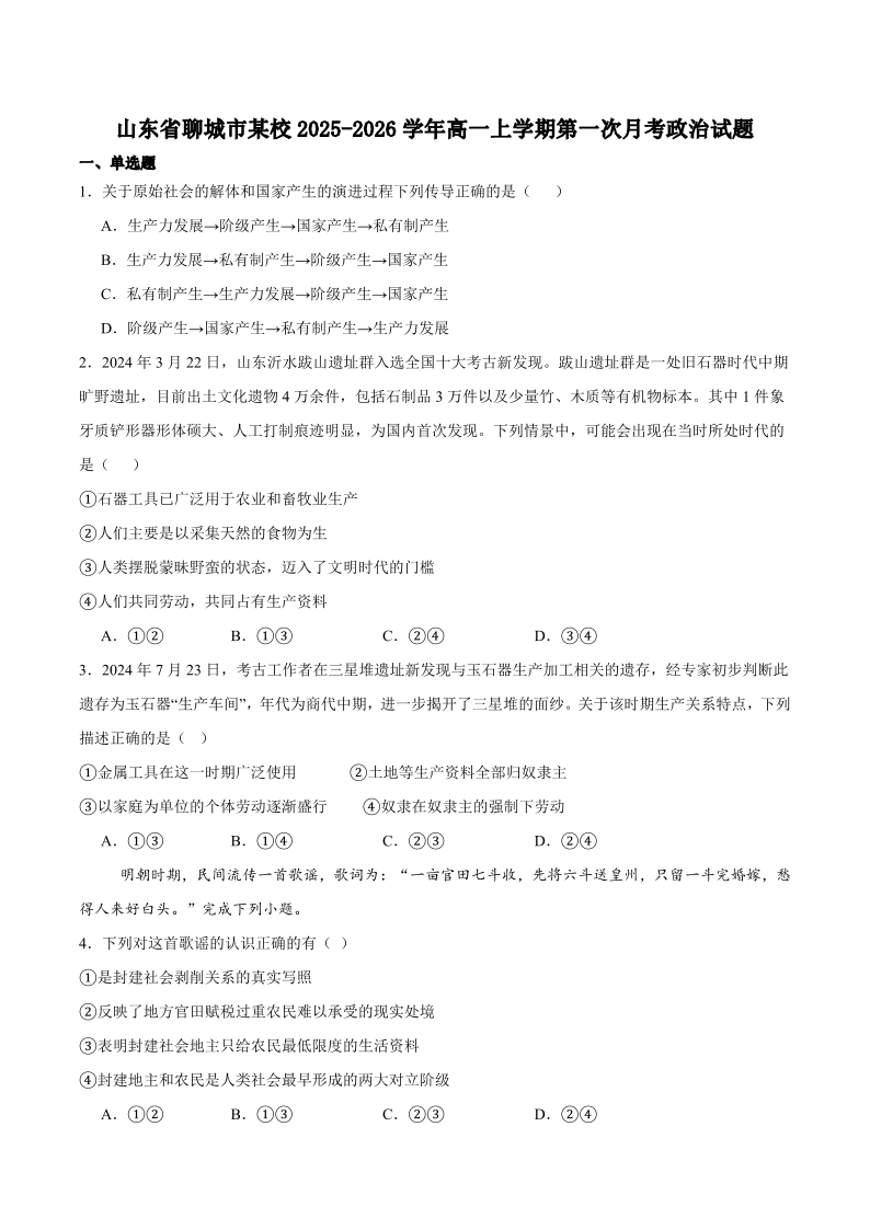 高一政治+答案--山东省聊城市某校2025-2026学年高一上学期第一次月考
