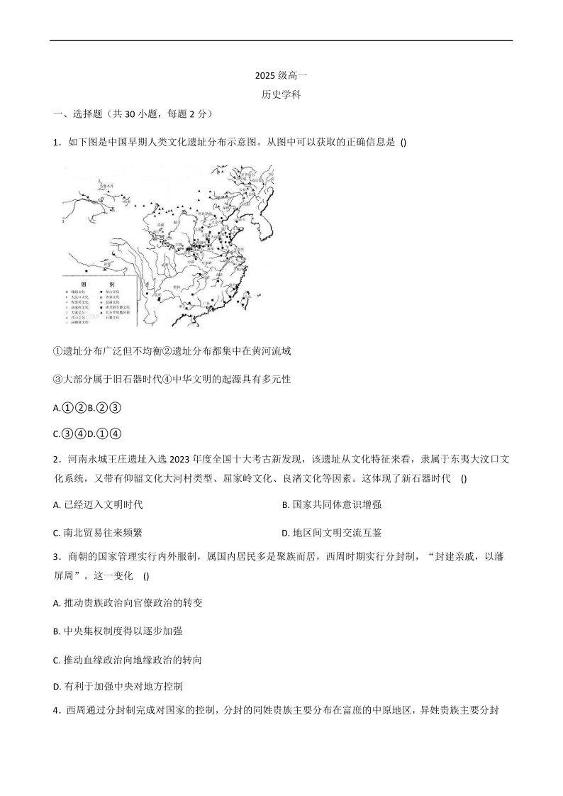 高一历史+答案--山东省聊城市某校2025-2026学年高一上学期第一次月考