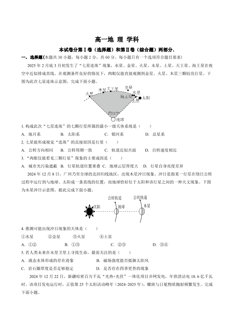高一地理+答案--山东省聊城市某校2025-2026学年高一上学期第一次月考