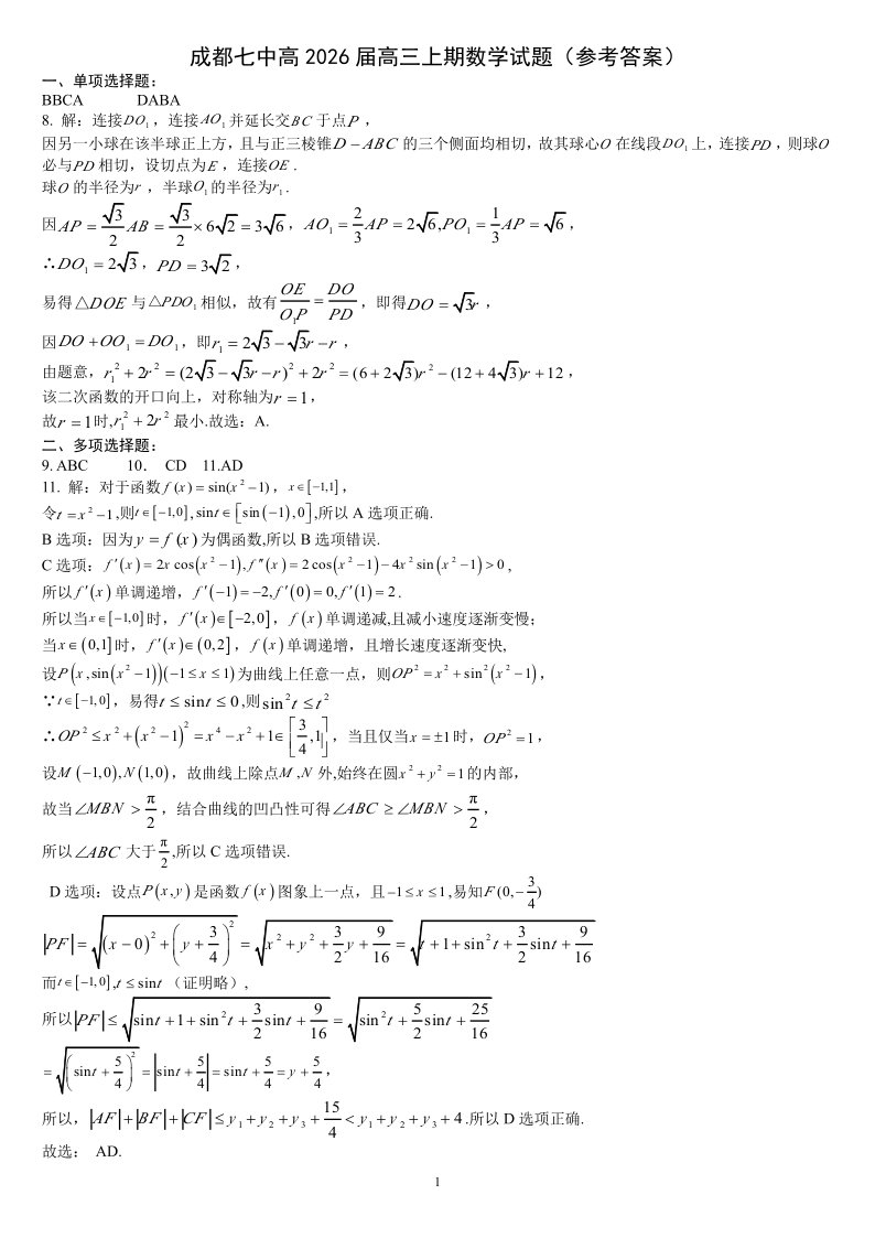 高三数学答案--四川省成都市第七中学2026届高三上学期10月月考