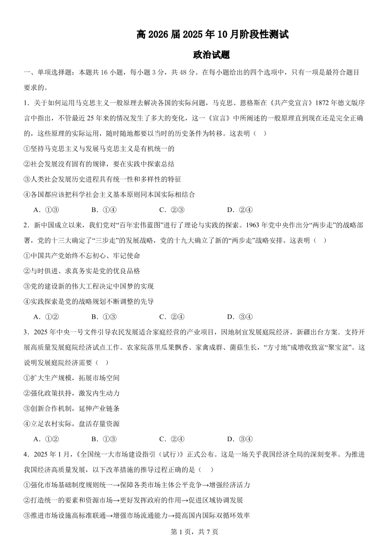 高三政治--四川省成都市第七中学2026届高三上学期10月月考