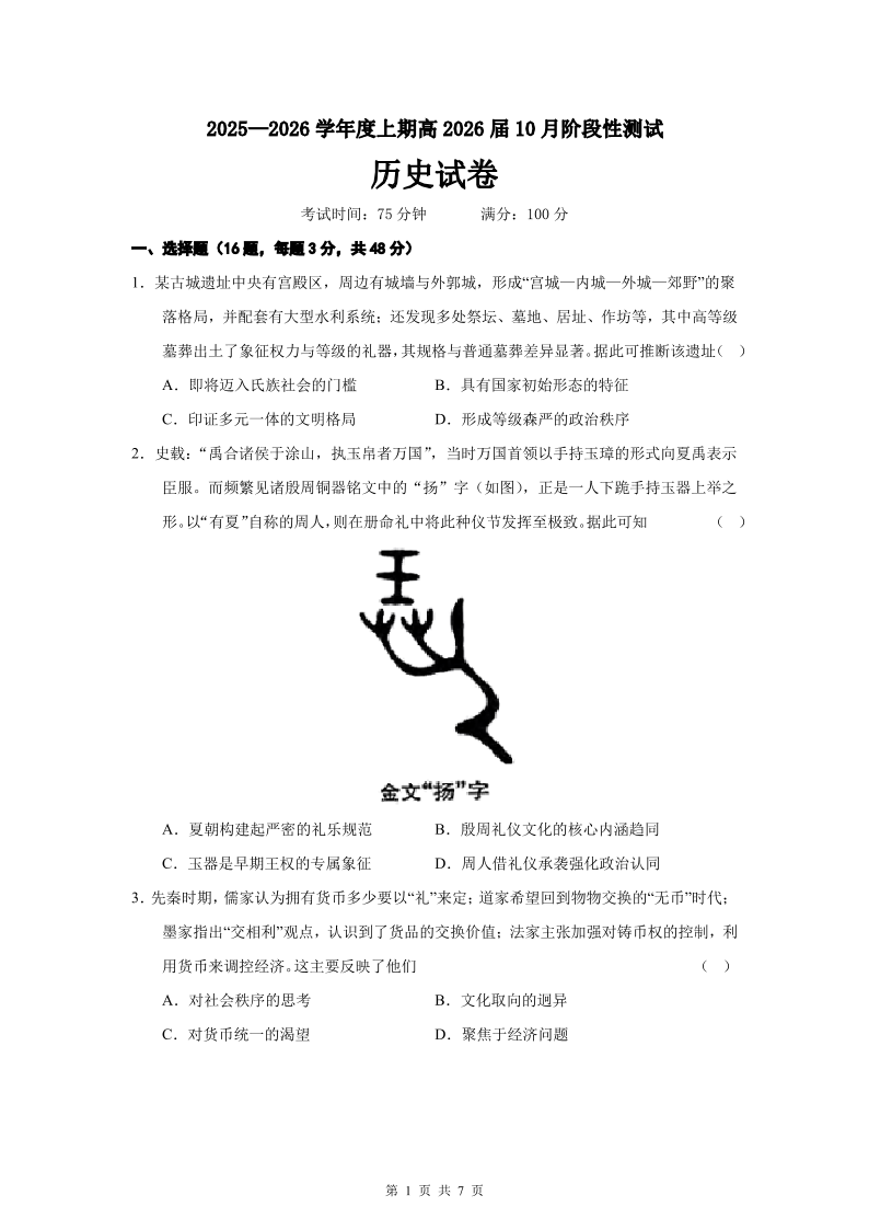 高三历史--四川省成都市第七中学2026届高三上学期10月月考