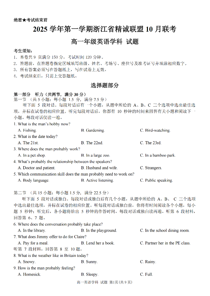 高一英语--浙江精诚联盟2025-2026学年高一上学期10月联考