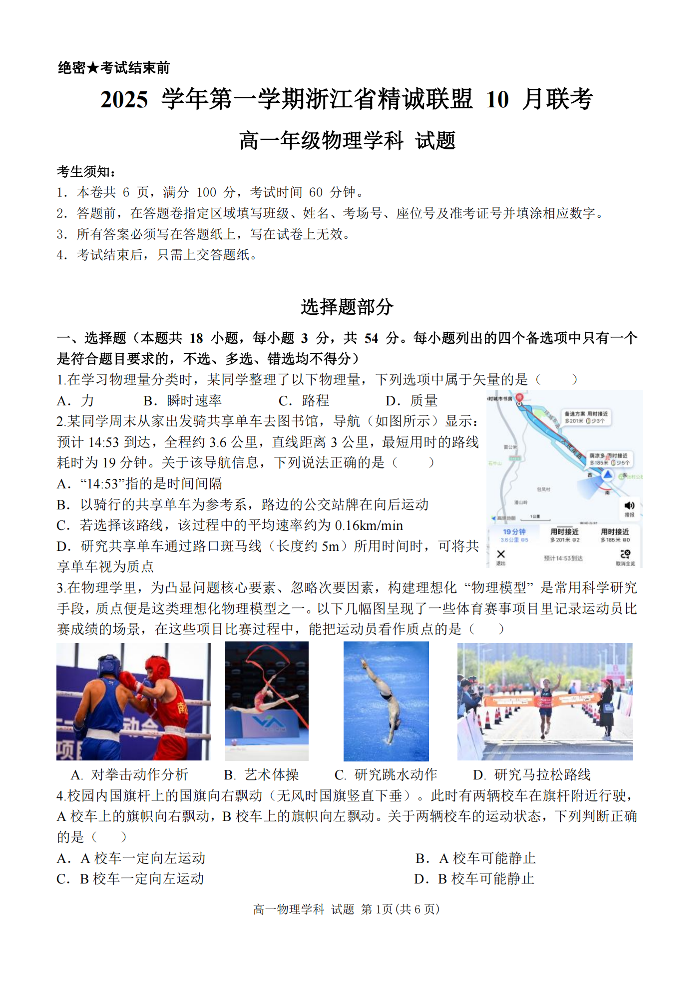 高一物理--浙江精诚联盟2025-2026学年高一上学期10月联考