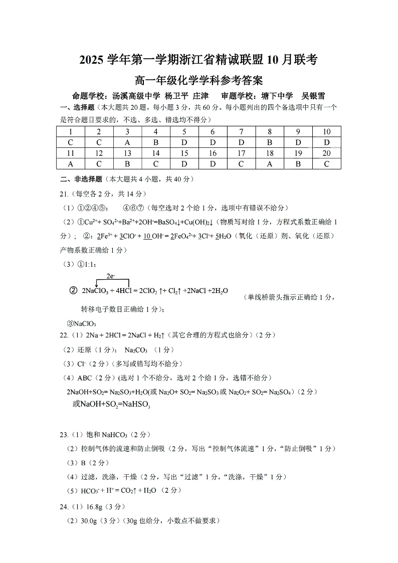 高一化学答案--浙江精诚联盟2025-2026学年高一上学期10月联考