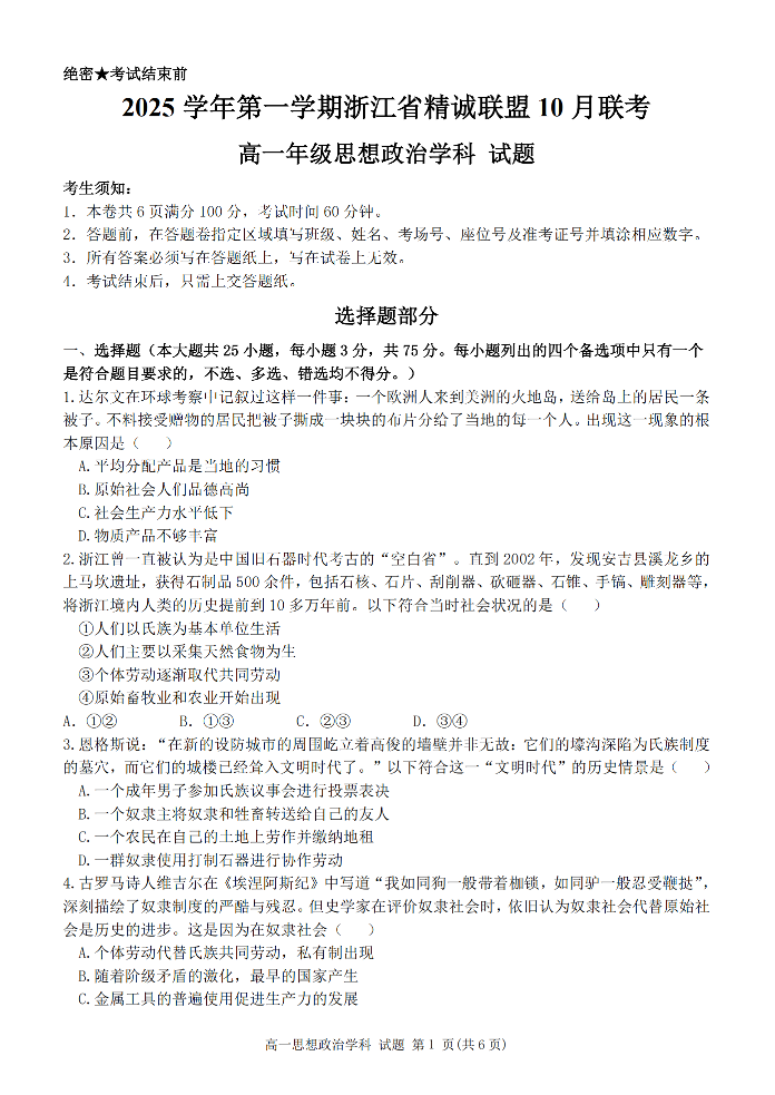 高一政治--浙江精诚联盟2025-2026学年高一上学期10月联考