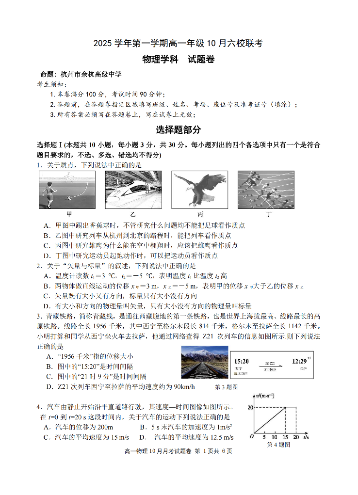 高一物理--浙江省六校联盟2025-2026学年高一上学期10月月考