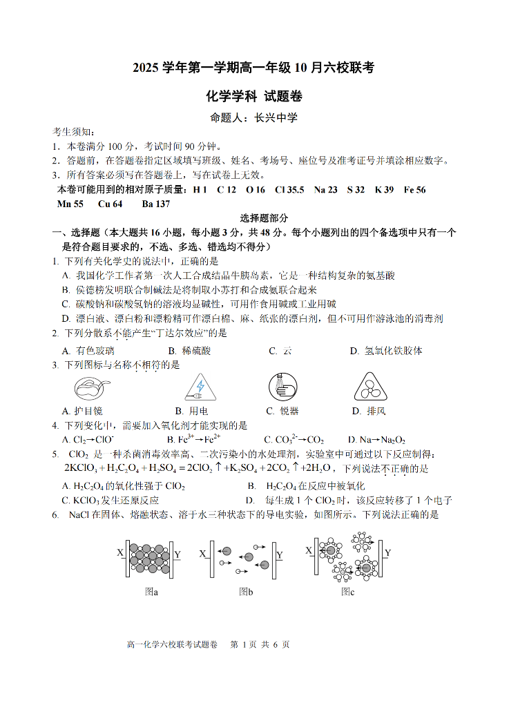 高一化学--浙江省六校联盟2025-2026学年高一上学期10月月考