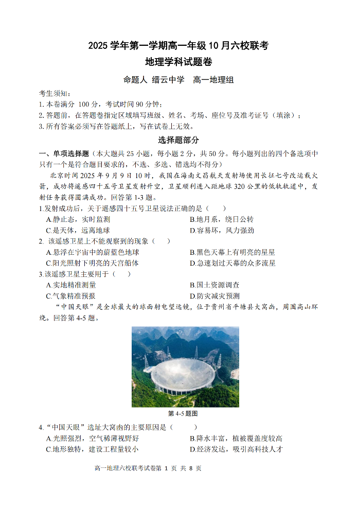 高一地理--浙江省六校联盟2025-2026学年高一上学期10月月考