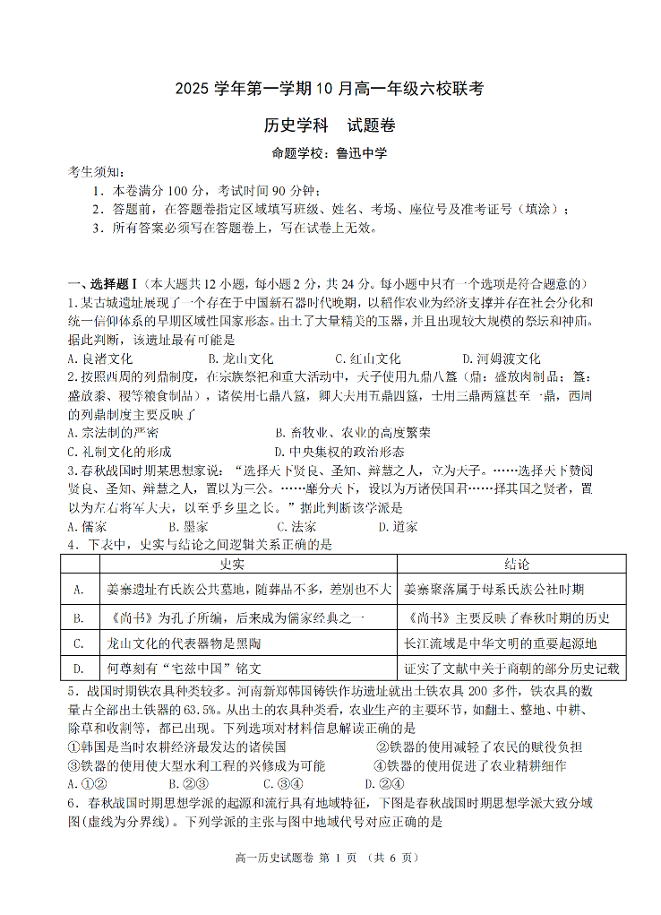 高一历史--浙江省六校联盟2025-2026学年高一上学期10月月考