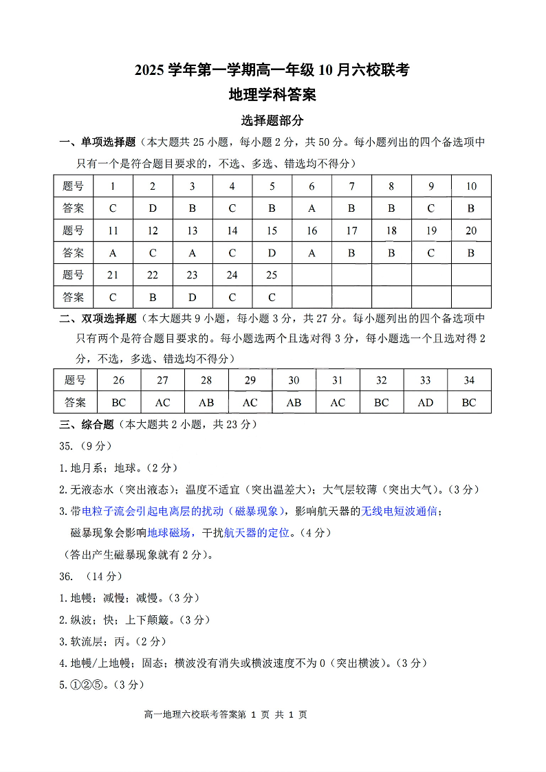 高一地理答案--浙江省六校联盟2025-2026学年高一上学期10月月考