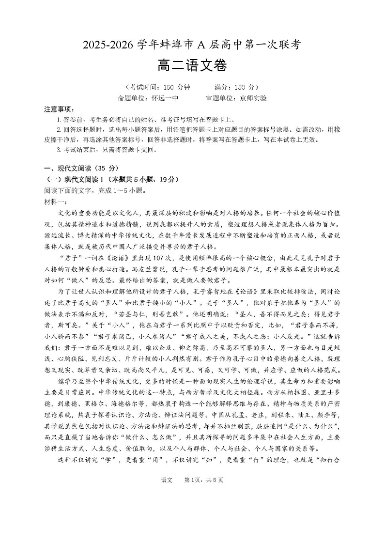 高二语文+答案--安徽省蚌埠市A层高中2025-2026学年高二上学期10月月考