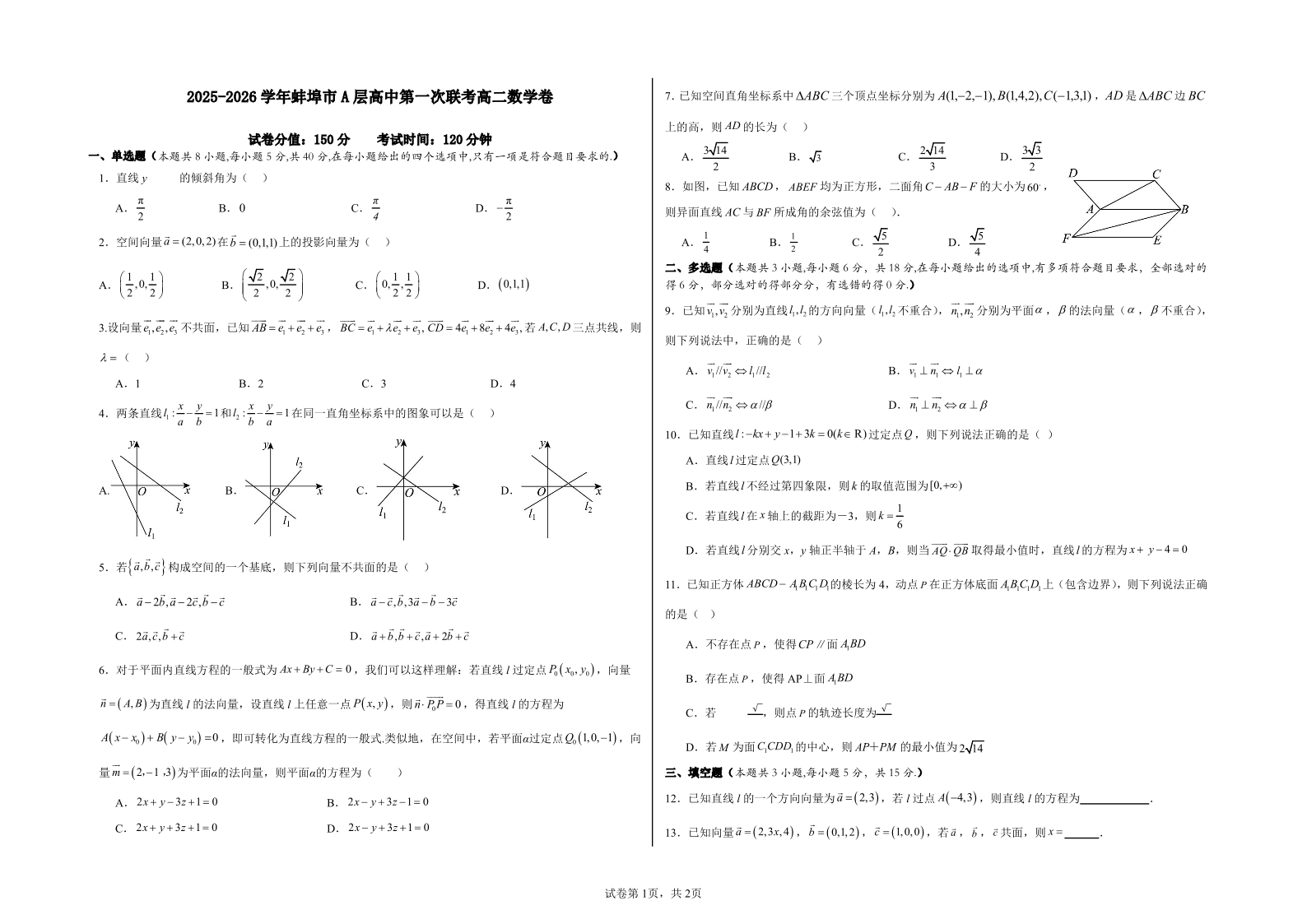 高二数学+答案--安徽省蚌埠市A层高中2025-2026学年高二上学期10月月考