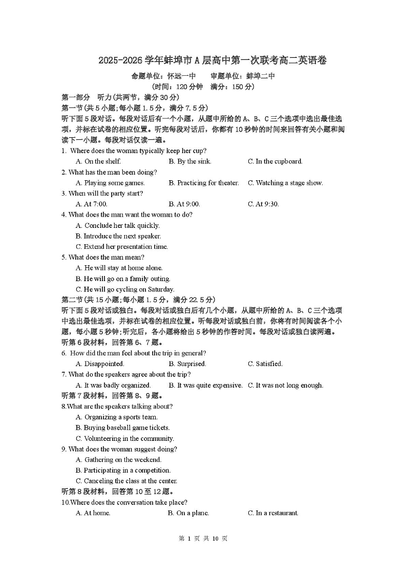 高二英语+答案--安徽省蚌埠市A层高中2025-2026学年高二上学期10月月考