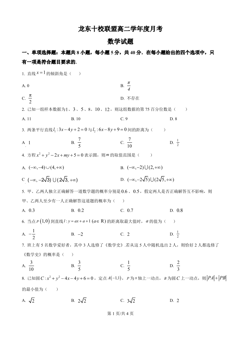 高二数学(原卷版)--黑龙江省龙东十校联盟2025-2026学年高二上学期10月月考