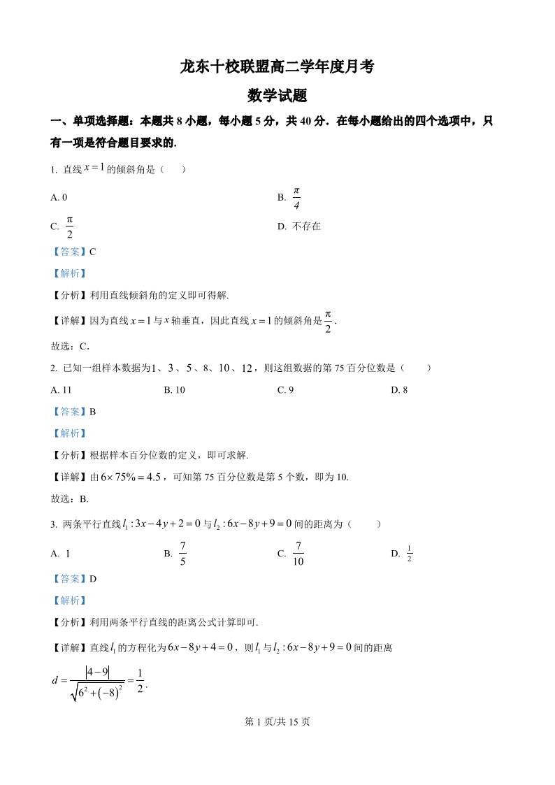 高二数学(精品解析版)--黑龙江省龙东十校联盟2025-2026学年高二上学期10月月考