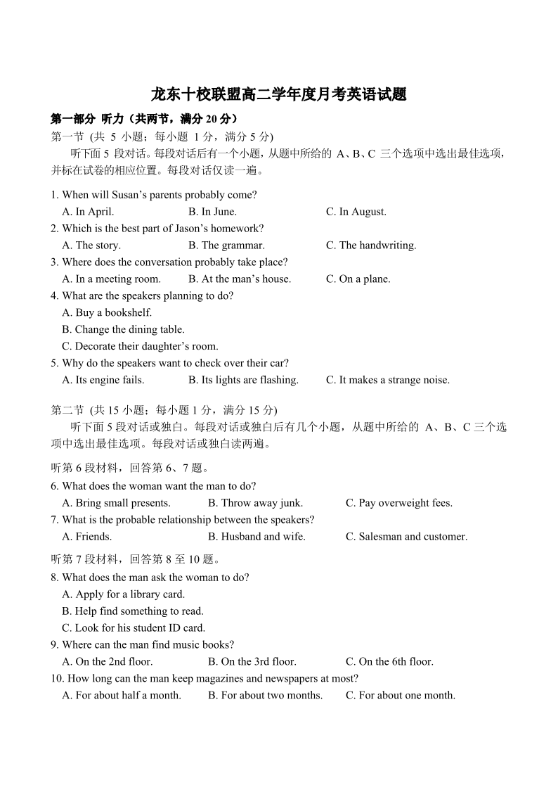 高二英语+答案--黑龙江省龙东十校联盟2025-2026学年高二上学期10月月考