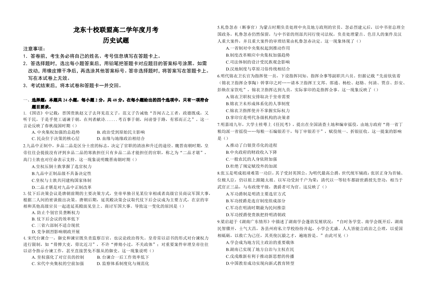 高二历史--黑龙江省龙东十校联盟2025-2026学年高二上学期10月月考