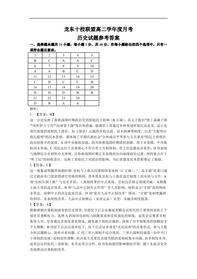 高二历史答案--黑龙江省龙东十校联盟2025-2026学年高二上学期10月月考