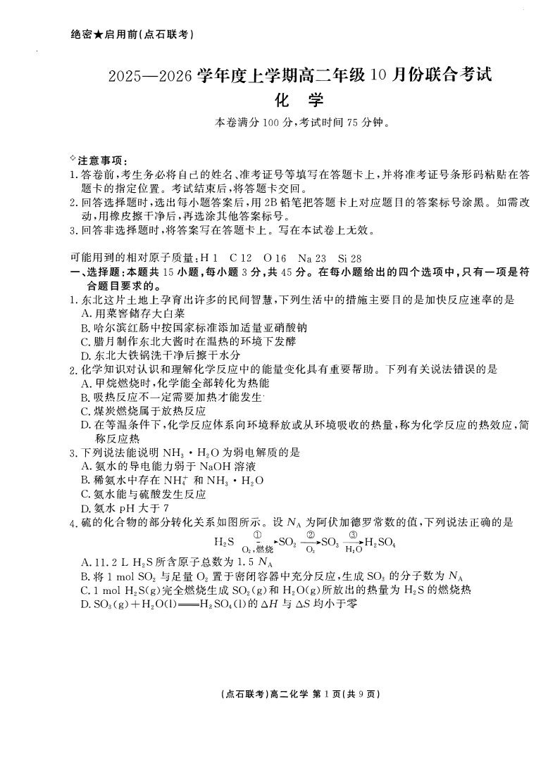 高二化学--辽宁省点石联考2025-2026学年高二上学期10月月考